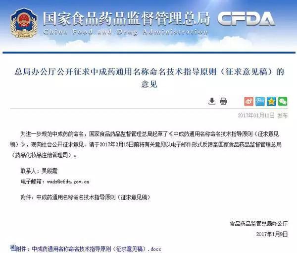 2017年1月9日,国家食品药品监管总局就《中成药通用名称命名技术指导原则(征求意见稿)》(以下简称《意见稿》)向社会公开征集修改建议。