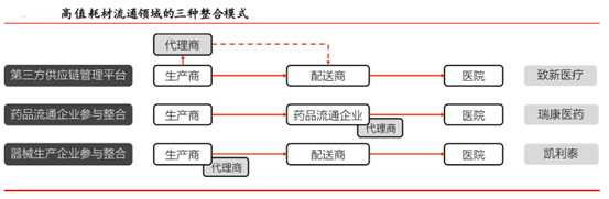 面对未来 2-3 年高值耗材流通领域确定性的整合盛宴,各路豪杰蜂拥而至,各显身手,我 们主要将它们分为三种模式:第三方供应链管理平台:既不依附医院,也不倾向特定品牌,专注搭建连接厂商(或代理 商)与医院间专业的耗材流通配送管理平台,提供高值耗材从厂家到医院再到患者的全流程可追溯的管理服务体系,以致新医疗为代表; 药品流通企业:以现有医院终端客户为协同,切入高值耗材流通领域,培育新的利润增长点,也能寻求业务延伸的更多可能,以瑞康医药为代表; 器械生产企业:通过整合高值耗材流通企业,进而能掌控医院终端(因为国内高值耗材的销售模式基本都是经销代理),便于自身产品销售(包括在研和收购),以凯利泰为代表。