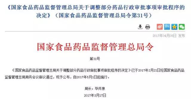 4月5日,国家食品药品监督管理总局局长毕井泉签署第31号总局令,公布《国家食品药品监督管理总局关于调整部分药品行政审批事项审批程序的决定》(以下简称《决定》)。