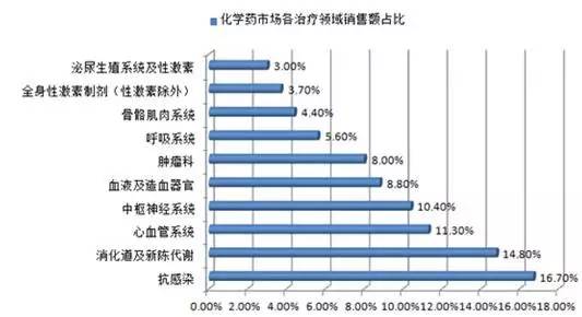 数据显示,2015年中国化学药市场各治疗领域中,抗感染药的市场份额最大,为16.7%,其次为消化道及新陈代谢药和心血管系统药。
