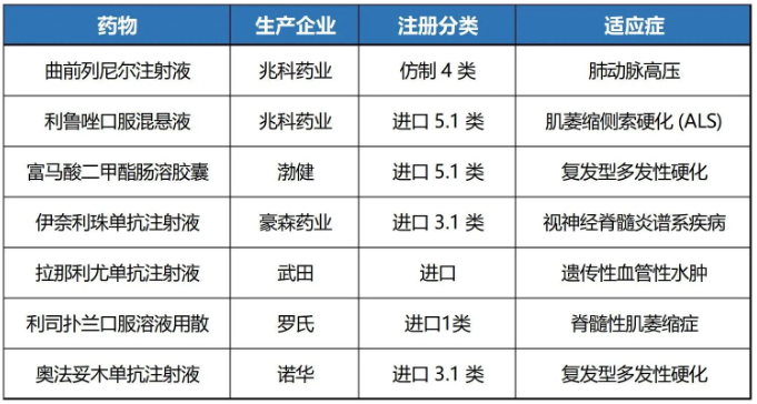 豪森药业引进的伊奈利珠单抗注射液是国内首款、也是目前唯一一款获批上市的CD19单抗,用于视神经脊髓炎谱系疾病成人患者的治疗,为该适应症首个纳入国家医保的药品;罗氏的利司扑兰口服溶液用散适用于脊髓性肌萎缩症(SMA),是首个在中国获批治疗SMA的口服疾病修正治疗药;诺华的奥法妥木单抗注射液属于抗人CD20的全人源免疫球蛋白G1单抗,用于治疗复发型多发性硬化。
